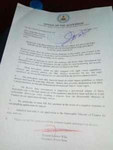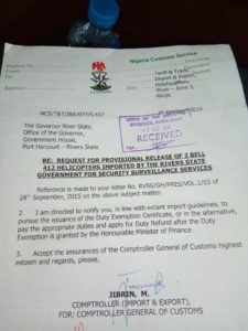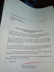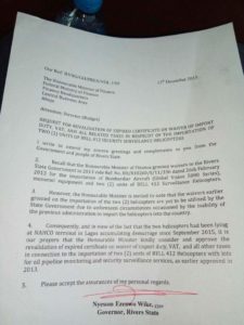 He explained that he wrote the letter following the high custom duty charged for the helicopters and the refusal of the present administration to grant the Rivers State Government the waiver to clear the two armoured helicopters.