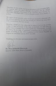 The letter of reminder, also signed by the Speaker and submitted by the Deputy Speaker, Hon Segun Adewumi and Chairman of the House Committee on Information, Dr Samuel Omotoso read; “We write to remind you of our petition dated 24th October 2016, which was submitted and duly received in your office on 27th October 2016.