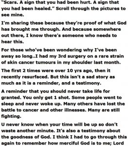 He wrote, “A wise man once said this: ‘Scars. A sign that you had been hurt. A sign that you had been healed.’ Scroll through the pictures to see mine.
