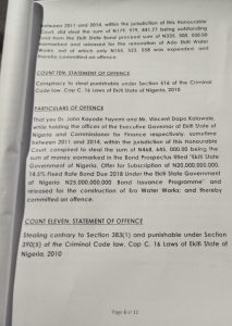 Count 12 of the criminal charge, which bordered on conspiracy to steal and punishable under Section 516 of the Criminal Code law, Cap C. 16 Laws of Ekiti State, 2010 reads; “That you Dr John Kayode Fayemi and Mr Vincent Dapo Kolawole, while holding the offices of the Executive Governor of Ekiti State of Nigeria and Commissioner for Finance respectively, sometime between 2011 and 2014, within the jurisdiction of this Honorable Court, conspired to steal the sum of N2,750,000,000.00 (N2.75 billion) being the sum of money earmarked in the Bond Prospectus titled; ‘Ekiti State Government of Nigeria, Offer for Subscription of N20,000,000,000 (N20 billion). 14.5% Fixed rate Bond Due 2018 Under the Ekiti State Government of Nigeria N25,000,000,000.00 Bond Issuance Programme ‘ and released for the construction of Ultra-Modern Market in Ekiti State, which you never built; and thereby committed an offence.”