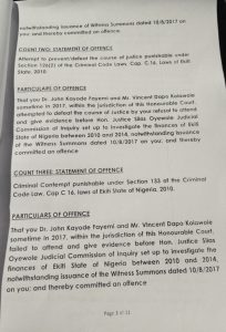 Fayemi and Kolawole were also charged with criminal contempt for refusing to appear before the Judicial Commission of Inquiry, an offence punishable under Section 13 of the Commission of Inquiry Law, Cap C. 10, Laws of Ekiti State, 2010, Section 126(2) of the Criminal Code laws, Cap C. 16, Laws of Ekiti State, 2010 and Criminal Contempt punishable under Section 133 of the same criminal code.