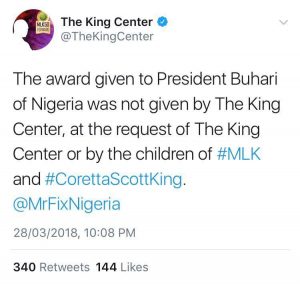 The centre says “The award given to President Buhari of Nigeria was not given by The King Center, at the request of The King Center or by the children of #MLK and #CorettaScottKing.