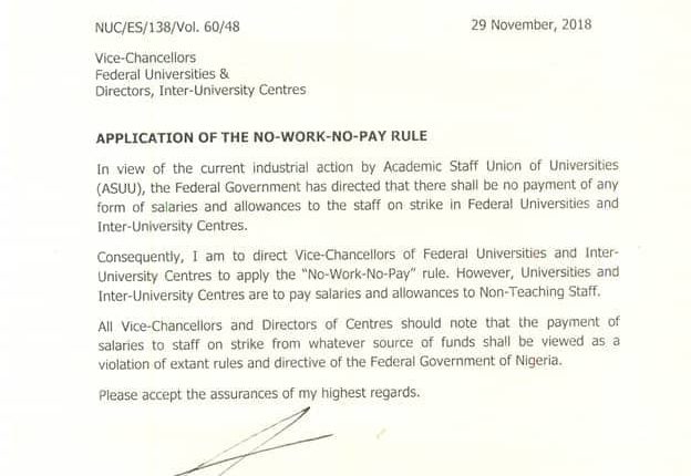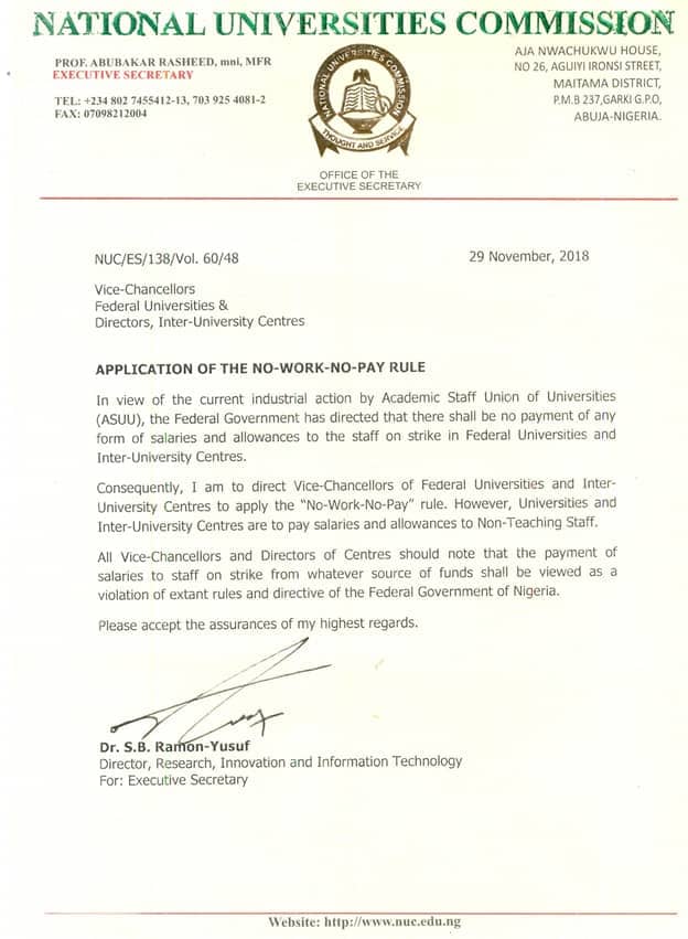 The no-work-no-pay rule was contained in a memo issued to universities and inter-varsity centres by the National Universities Commission (NUC).