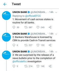 Union Bank said in its response to Tweet by the EFCC that it was surprised by the release of a news bulletin prior to the completion of @officialefcc investigation.