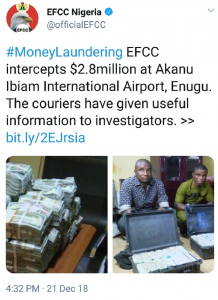 EFCC had announced that it intercepted $2.8m (N1.02bn) from two people suspected to be money launderers at Akanu Ibiam International Airport, Enugu.