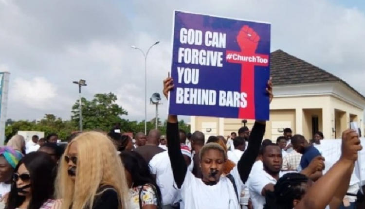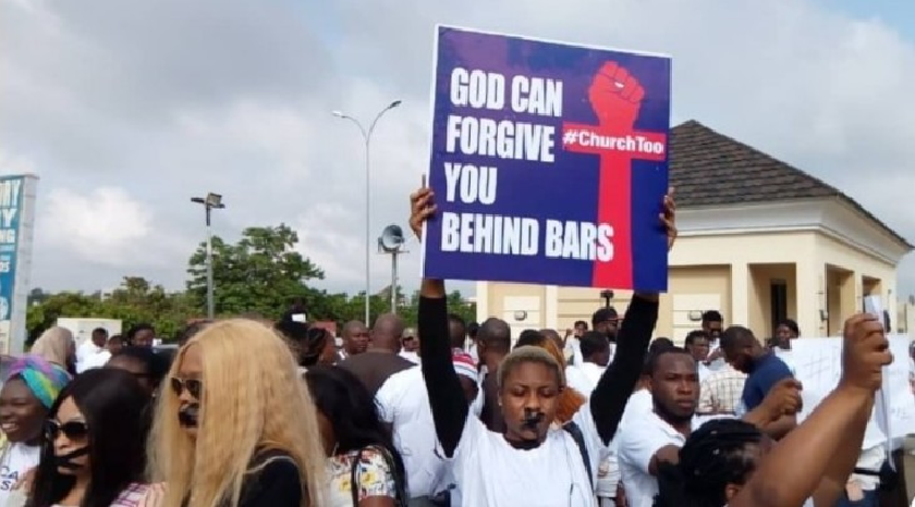 Some of the placards held by protesters read ‘We are watching you,’ ‘Your Pastor is not your God,’ ‘Thou shall not rape’ and ‘No to sexual abuse in my church’ among others with the hashtag ‘#ChurchToo.’