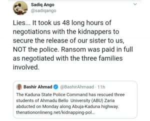 Bashir Ahmad, personal assistant to the president on new media, shared a report quoting the police claim, this elicited a reaction from Sadiq Ango, a Twitter user, who said the police lied and that it took the families 48 hours of negotiations and payment of ransom before the students were released.