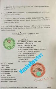 Mrs Dakolo also demanded that a cost of action estimated at the sum of N10,000,000 (ten million naira) be paid.