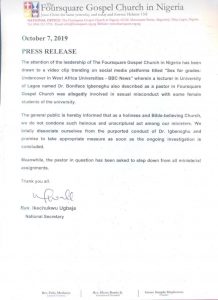 “The attention of the leadership of The Foursquare Gospel Church in Nigeria has been drawn to a video clip trending on social media platforms titled ‘Sex for grades: Undercover in West Africa Universities – BBC News’ wherein a lecturer in University of Lagos named Dr. Boniface Igbeneghu also described as a pastor in Foursquare Gospel Church was allegedly involved in sexual misconduct with some female students of the University,” the statement read.