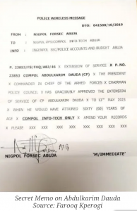 The memo read in part, “Extension of Service P.No 23853 COMPOL Abdulkarim Dauda (CP) X. The President X Commander in Chief of the Armed Forces X Chairman Police Council X has graciously approved the extension of service of CP Abdulkarim Dauda to May 13, 2023, X When he would have attained sixty (60) years of age X COMPOL Info-Tech only X Amended your records please.”