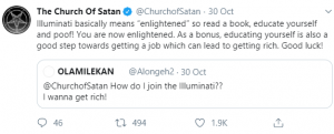 “Illuminati basically means “enlightened” so read a book, educate yourself and poof! You are now enlightened. As a bonus, educating yourself is also a good step towards getting a job which can lead to getting rich. Good luck!” @ChurchofSatan replied the desperate young man.