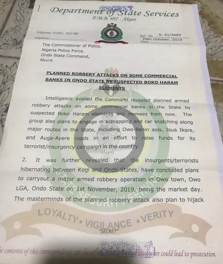 “It was further revealed tagged that the insurgents/terrorists hibernating between Kogi and Ondo States have concluded plans to launch an armed robbery attack on Owo town on November 1, 2019 being the market day.”