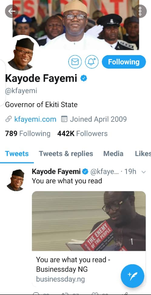Ekiti State Governor, Dr. Kayode Fayemi has been pictured reading a book titled “The enemy of the people” fueling insinuations that he was actually reading what he is as a person – enemy of the people.