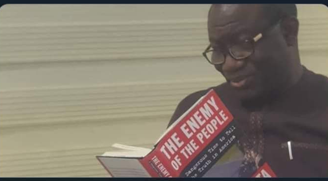 “You’re what you read,” Fayemi pictured reading book titled “The Enemy Of The People”