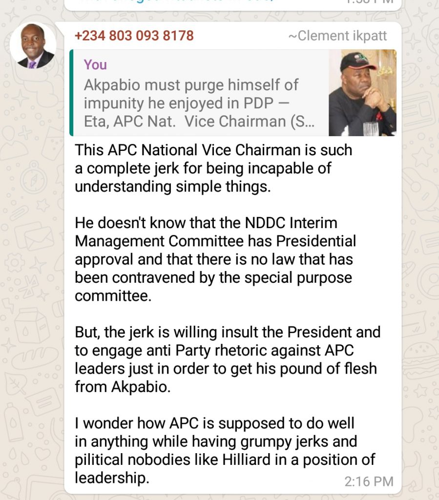 Akpabio spoke through his close Aide Mr. Clement Ikpat. In his reply on WhatsApp group, Ikpat lambast the National Vice Chairman for engaging in what he termed “anti-party rhetoric”.