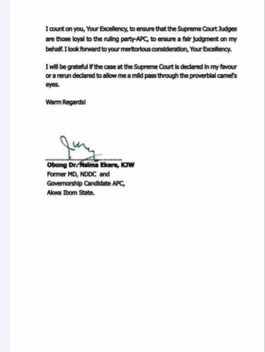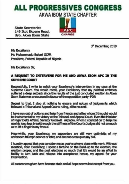 The media space is awash with a clearly forged document to the effect that Mr. Nsima Ekere, the Governorship Candidate of the All Progressives Congress (APC) in the March 9, 2019 elections has written to President Muhammadu Buhari seeking “intervention” on his behalf and that of the All Progressives Congress (APC), Akwa Ibom State in the Governorship Appeal pending at the Supreme Court. The said letter goes on to conjure up other inanities.