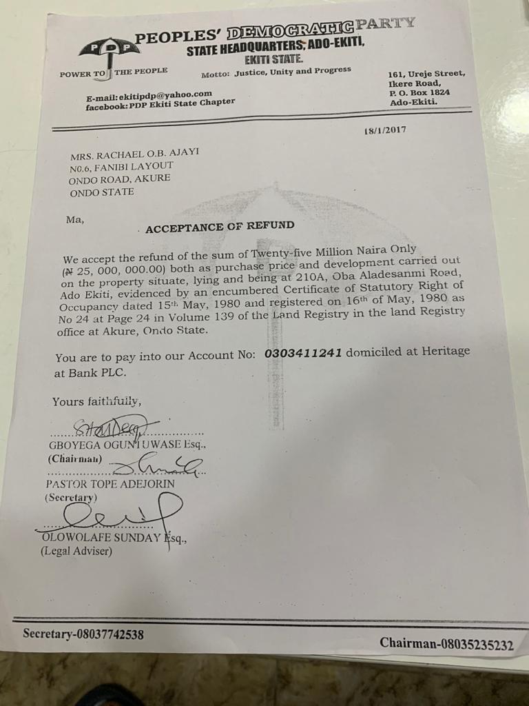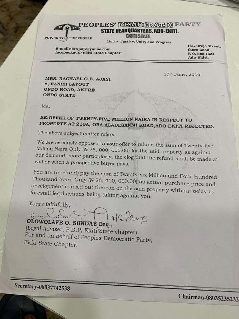 Revealed!! Fayose Didn’t Sell Ekiti PDP Secretariat, Party Chairman Did.. See Documents
