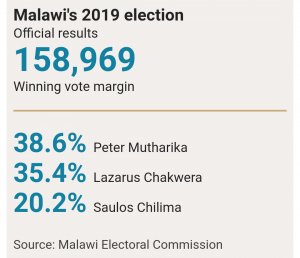 Mr Chilima, a former ally of the president, got 20.2%. He was the candidate for the UTM.
