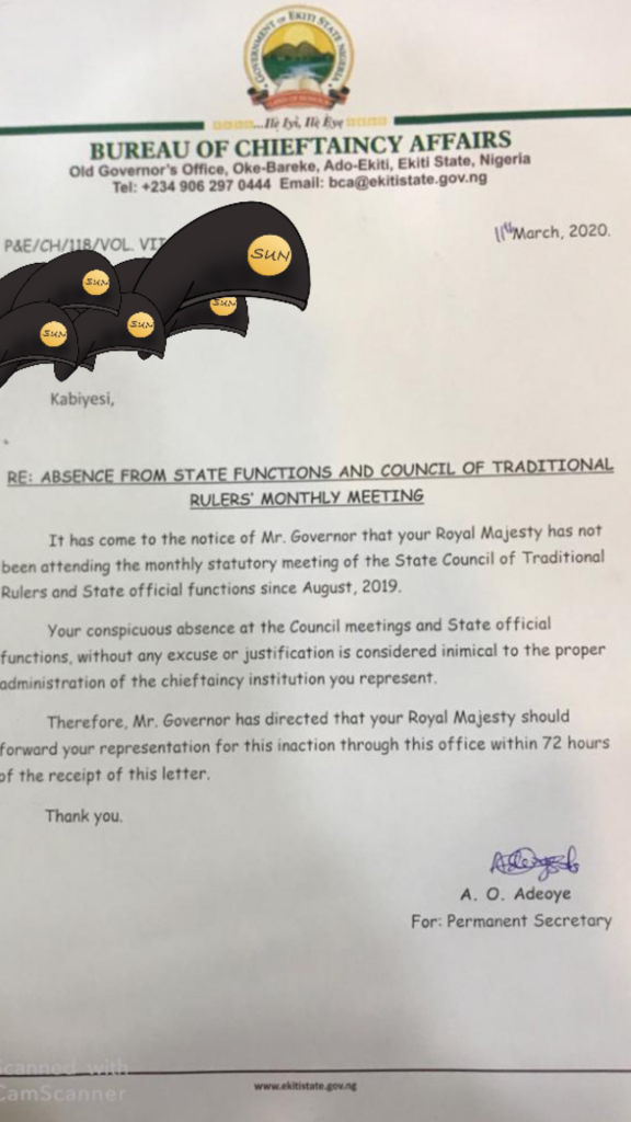Source told Wazobia Reporters that a query was issued to the Obas today, giving them 72 hours to explain why they should not be removed for shunning government functions since August 2019.