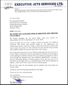 “Please the flight was to carry a Judge to Abuja on Sunday 14th, 2020 as requested and permit was granted based on the application, but unfortunately when I called the Judge on Saturday morning to inform him that we have the permit, he then said that he has reached Abuja already with a different flight that someone gave him a lift to Abuja.