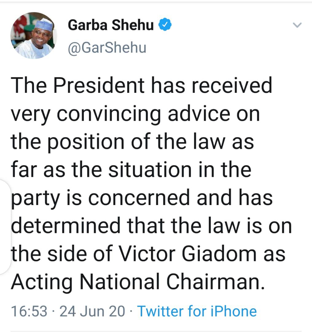 The President has received very convincing advice on the position of the law as far as the situation in the party is concerned and has determined that the law is on the side of Victor Giadom as Acting National Chairman. Because will always act in accordance with the law, the President will be attending the virtual meeting Giadom called for tomorrow afternoon.