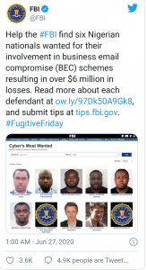 “Help the #FBI find six Nigerian nationals wanted for their involvement in business email compromise (BEC) schemes resulting in over $6 million in losses,” the US agency said on its verified Twitter handle.