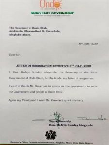 BREAKING: Ondo SSG, Abegunde, resigns Breaking NewsPolitics By By WazobiaReporters On Jul 6, 2020 Share Secretary to Ondo State Government, Ifedayo Abegunde, has resigned his appointment. His letter of resignation was made available to WazobiaReporters, was dated July 6, 2020. RELATED STORIES Mali Defence Minister Killed In Major Attack Apr 26, 2026 Makinde Under Fire Over Alleged N2bn Spending Apr 26, 2026 Fake News Fueled EndSARS Crisis – Lai Mohammed Apr 26, 2026 Related Posts Mali Defence Minister Killed In Major Attack Apr 26, 2026 Makinde Under Fire Over Alleged N2bn Spending Apr 26, 2026 Fake News Fueled EndSARS Crisis – Lai Mohammed Apr 26, 2026 Sponsored Ads He said his resignation takes effect today, Monday, July 7, 2020. LIST OF APPLICATIONS FOR REGULARISATION OF AREA COUNCIL LAND DOCUMENTS NULLIFIED/CANCELLED BY THE HONOURABLE MINISTER OF FCT Share