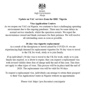 British High Commission in Nigeria has revealed that expired 30-day visas will be replaced for free, till the end of the year.