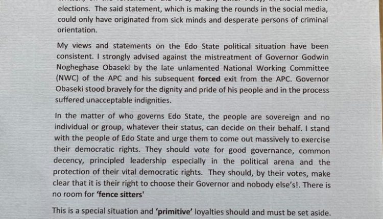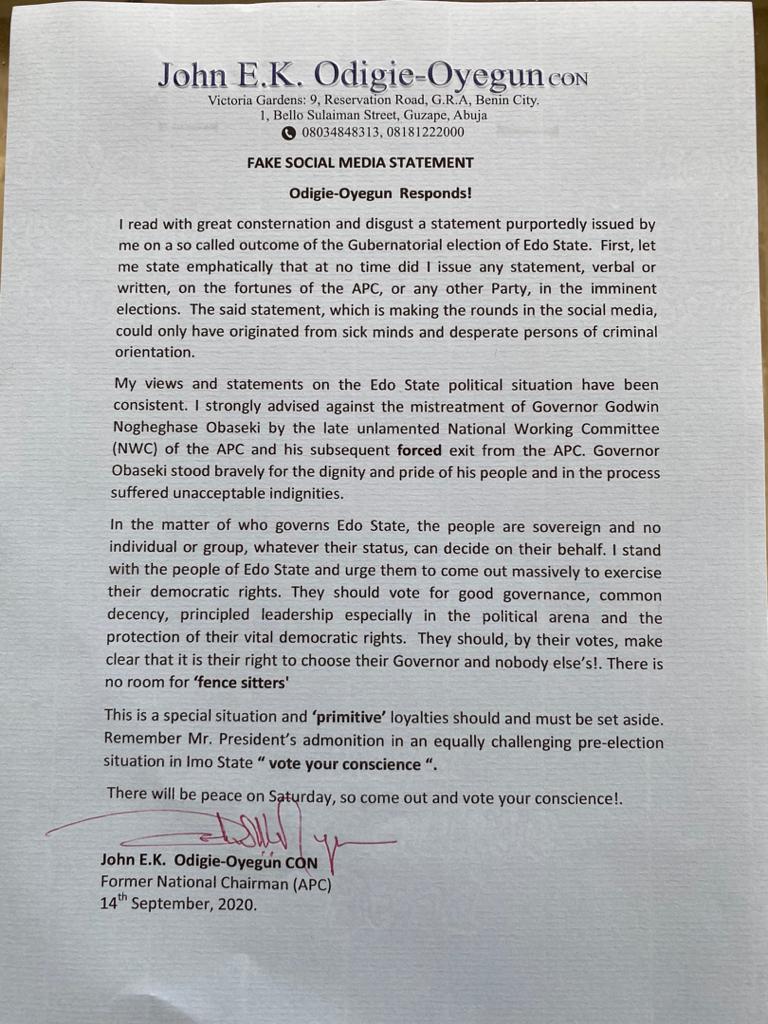 I read with great consternation and disgust a statement purportedly issued by me on a so called outcome of the gubernatorial election in Edo State.