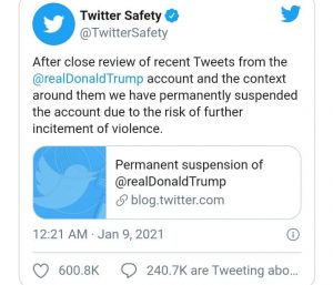 “After close review of recent Tweets from the @realDonaldTrump account and the context around them we have permanently suspended the account due to the risk of further incitement of violence.