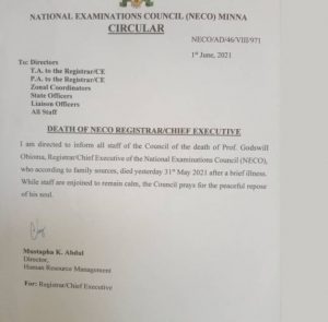 Prince Godswill Obioma, in a text message to NECO Director of Human Resources on behalf of the family, said: “Dear Sir, this is to formally inform you that my father Prof. Godswill Obioma the Registrar/Chief Executive of NECO passed to eternal glory yesterday 31/5/2021 after a brief illness.