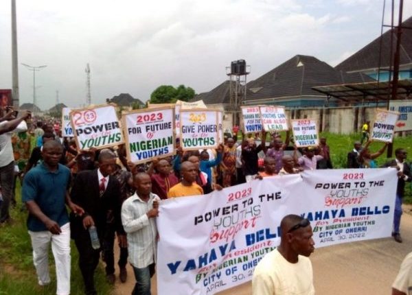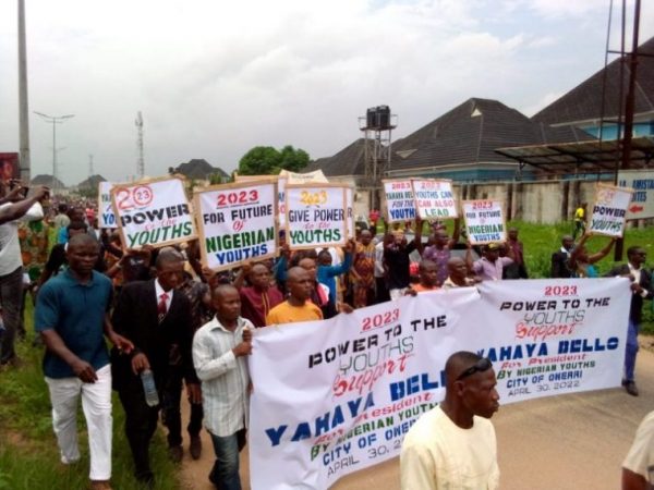 The youths, who started the procession from the MASSOB leader’s house in Owerri, marched through the streets, carrying different placards, with inscriptions such as: Power to the Youths, Support Yahaya Bello; Youths Can Also Lead; and Yahaya Bello for the Youths.