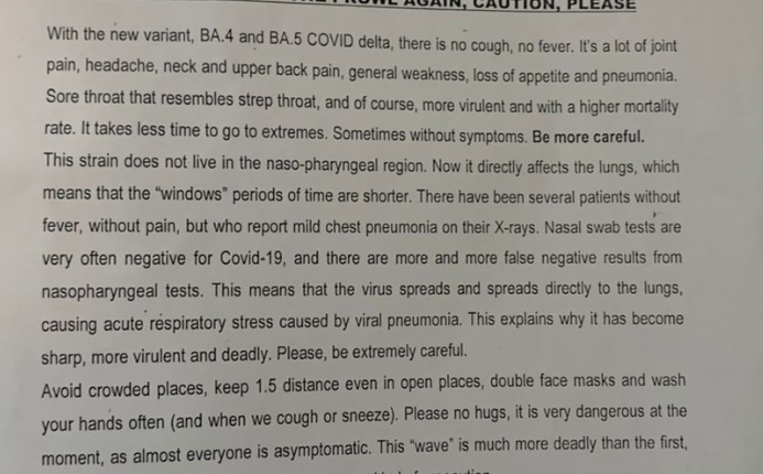 Titled: “FYI: COVID Is On The Prowl Again, Caution, Please,” the Head of Clinical Services warned that with the new variant, “BA.4 and BA.5 COVID delta, there is no cough, no fever,” adding, “It’s a lot of joint pain, headache, neck and upper back pain, general weakness, loss of appetite, and pneumonia.