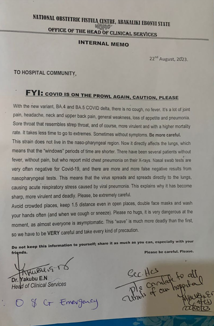 An internal memo of the National Obstetric Fistula Centre, Abakaliki, Ebonyi state capital has warned the hospital community that COVID-19 is back and deadlier than its variant that hit the world in 2019.