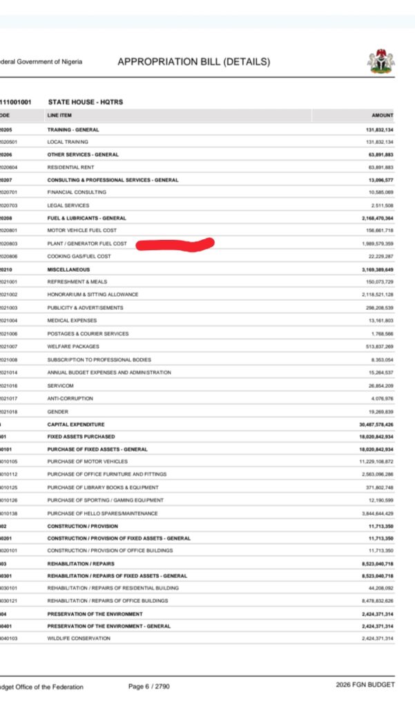 The spending appears under the State House Headquarters in the budget reviewed for 2026. About ₦1.99 billion is meant for generator fuel, while ₦17.2 million is reserved for maintenance, bringing the total cost close to ₦2 billion for the year.