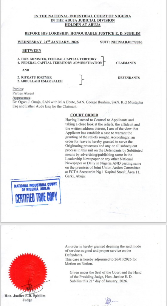 After reviewing the application, the presiding judge approved substituted service on the union leaders through newspaper publication and notices pasted at the FCTA secretariat.